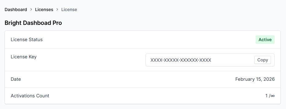 - Locate your active purchase of Bright Dashboard Pro.
