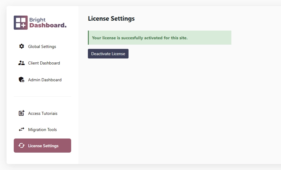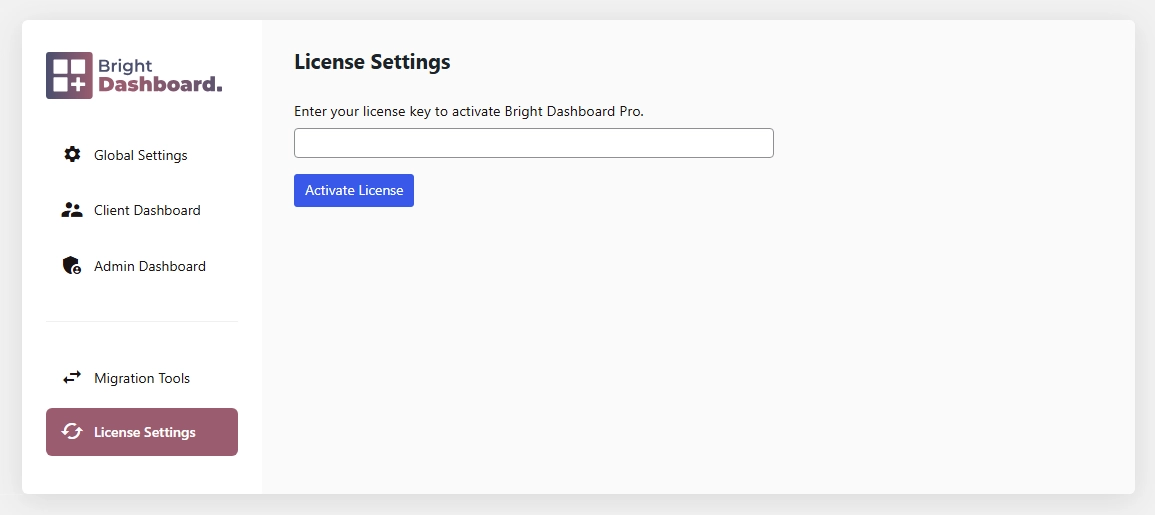 - In your WordPress menu, navigate to Bright Dashboard > License Settings.